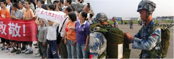 汶川地震后第二天,大批空降兵官兵飞赴抗震救灾前线。在最后送别救援部队的人群中,12岁的程强举起了“长大我当空降兵”的横幅。
