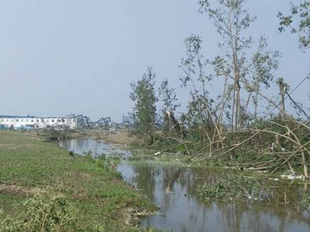 在通往阜宁的204国道旁,专家队目睹了龙卷风席卷后的一片狼藉地带,被扭曲成麻花状的铁塔散落在路边,许多树木被连根拔起或是撕裂开来。龙卷风对于许多人来说是一辈子都未目睹的恐怖自然灾害,此次阜宁县的龙卷风风力更是超过了17级,风度达到了73米/秒,照片拍摄地还仅仅是这次龙卷风的波及边缘地区,还未进入受灾更核心地带。