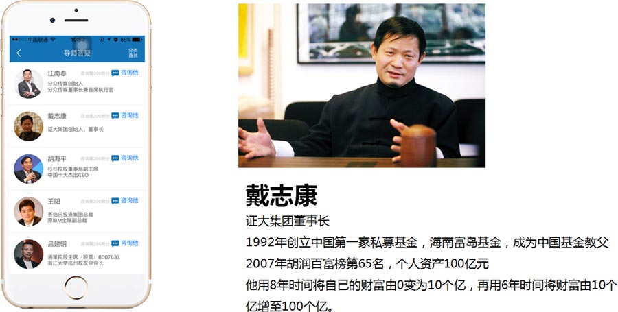 | 新常态下环境瞬息万变,兴衰成败就在一念之间。在发展的关键时刻,一个错误决定,可能就使你抱恨终身。一个正确决策,却可以让你受益一生。 现在加入华泰“师董会”,让百名中国先行的成功者及商业领袖,为你诊断把脉、牵线搭桥。在这里找到你一生中最好的导师朋友,建立24小时在线的“师董智囊团”,为您前行的道路划亮一根火柴,点亮一盏明灯! 咨询加入师董会事宜,请致电/微信:13718601312(李先生)! 【相关链接】 ·华泰“师董会”----在这里遇见您的私人董事 ·“师董会”走进小米-上市公司总裁为您解答“转型升级误区及对策” ·师董商学院游学上海站:七位商业大咖与您相约 |