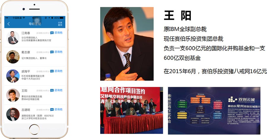 | 师董会:企业家O2O实战互动平台!移动APP + 高端社交 + 即时学习! 师董会是华泰益合公司响应国家“万众创新、大众创业”号召,由杉杉控股董事局副主席、中国十大杰出CEO胡海平联手分众传媒创始人江南春,证大集团董事长戴志康,赛伯乐集团总裁王阳等百名上市公司领袖创立的企业家O2O实战互动平台。 师董会以会员制的形式,通过与导师的互动,为创立初期或转型期的中小企业解决渠道、资金等问题。师董会让大企业与小企业携手,让成功者与成长者联盟,让中国商界的明天更美好! 咨询加入师董会事宜,请致电/微信:13718601312(李先生)! |